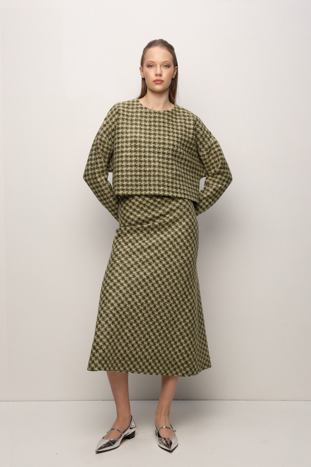 The Brahe skirt channels timeless sophistication with a modern twist. Tailored in a structured houndstooth wool blend, it features a clean A-line cut that flows into a graceful midi length. Its sculptural silhouette offers both comfort and elegance, making it a refined choice for versatile styling.