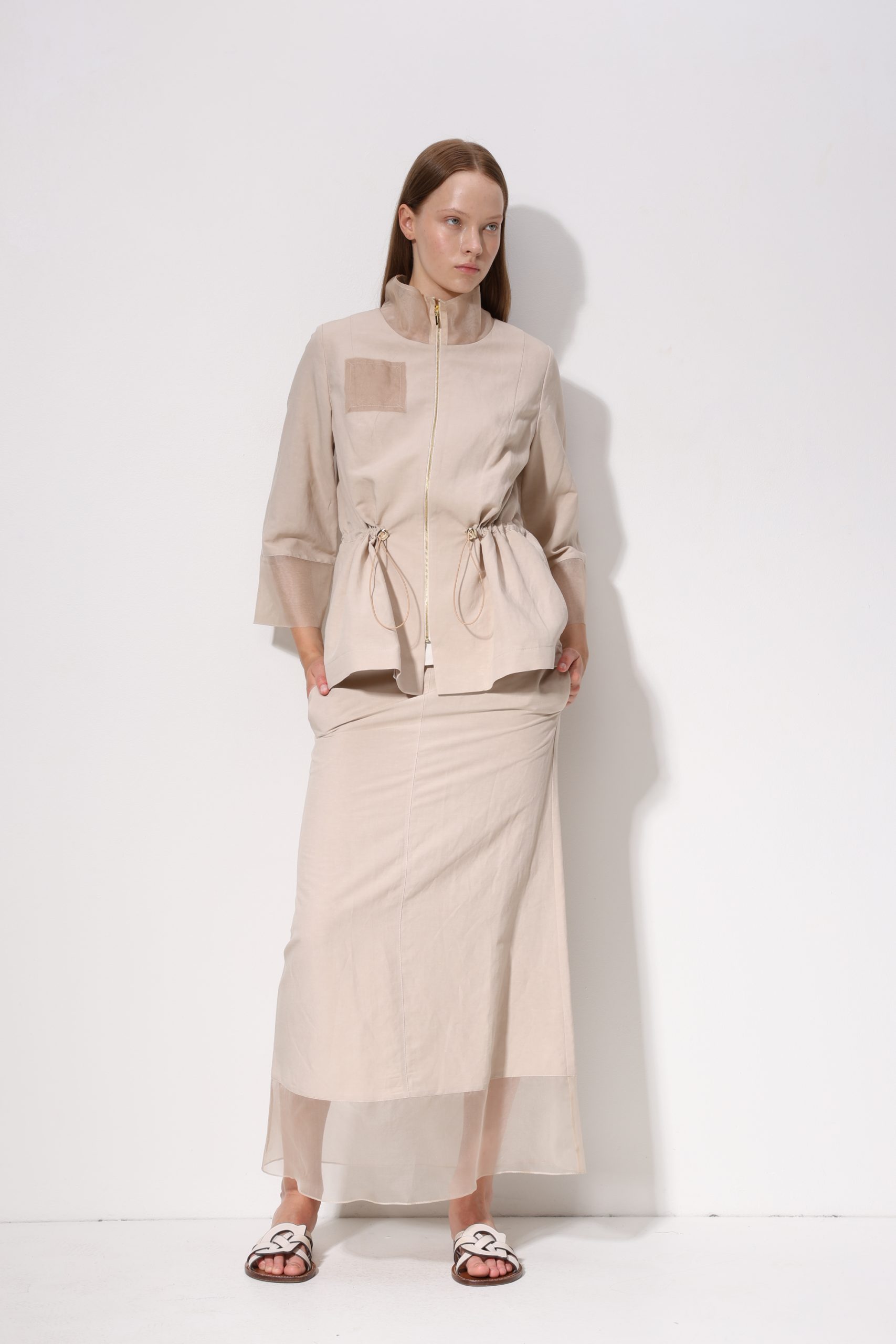 Mūsu modele valkā 38. izmēru, viņas augums ir 176 cm, krūtis 79 cm, viduklis 62 cm, gurni 90 cm.