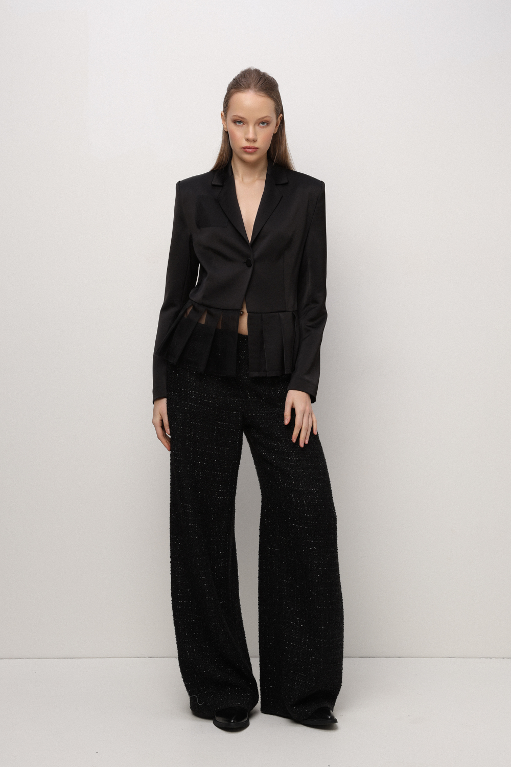 Wide black trousers in textured fabric with a subtle sheen, bringing fluid movement and an evening touch to the silhouette.