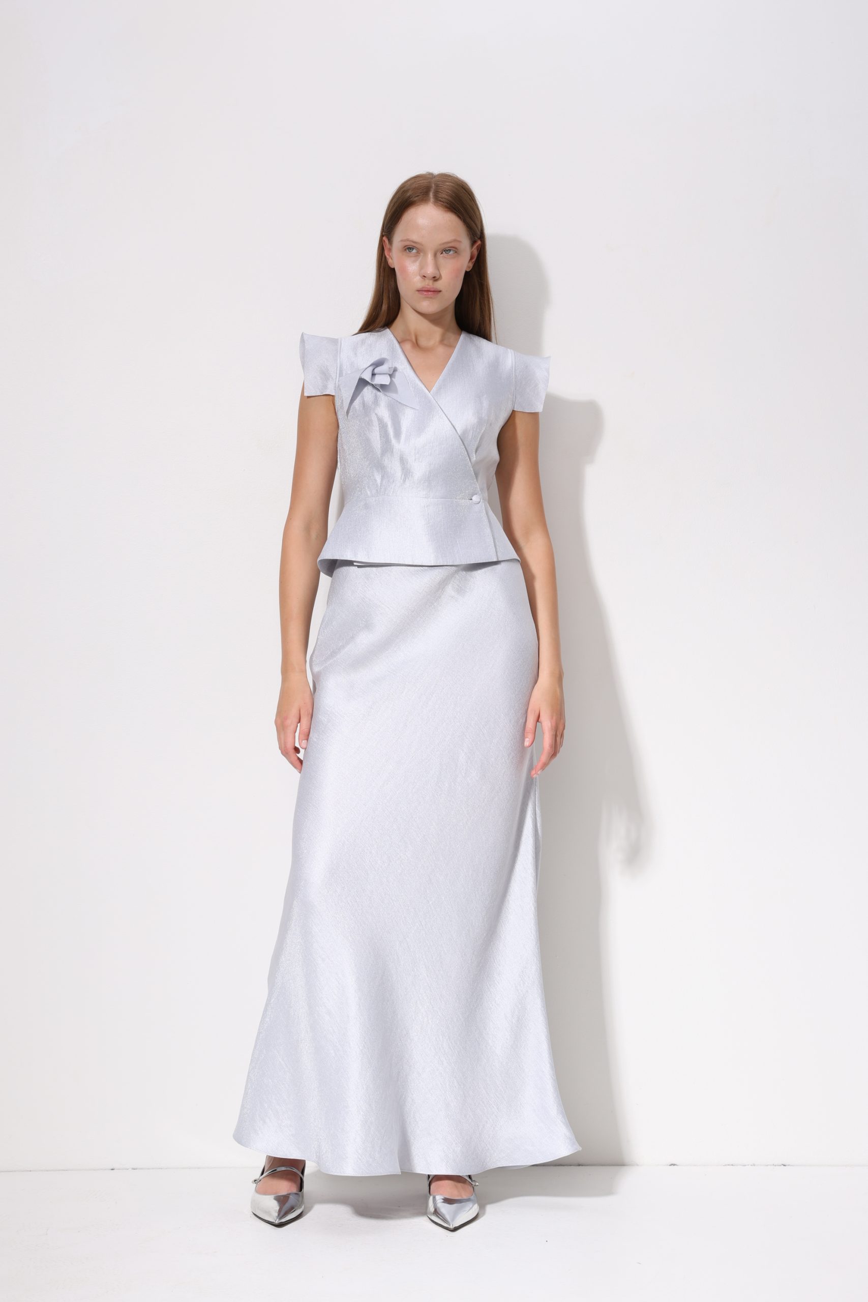 Mūsu modele valkā 38. izmēru, viņas augums ir 176 cm, krūtis 79 cm, viduklis 62 cm, gurni 90 cm.