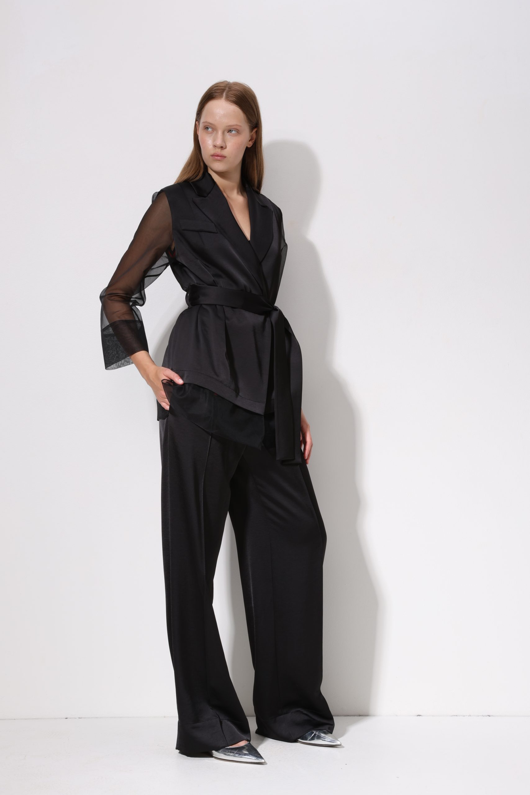 Mūsu modele valkā 38. izmēru, viņas augums ir 176 cm, krūtis 79 cm, viduklis 62 cm, gurni 90 cm.