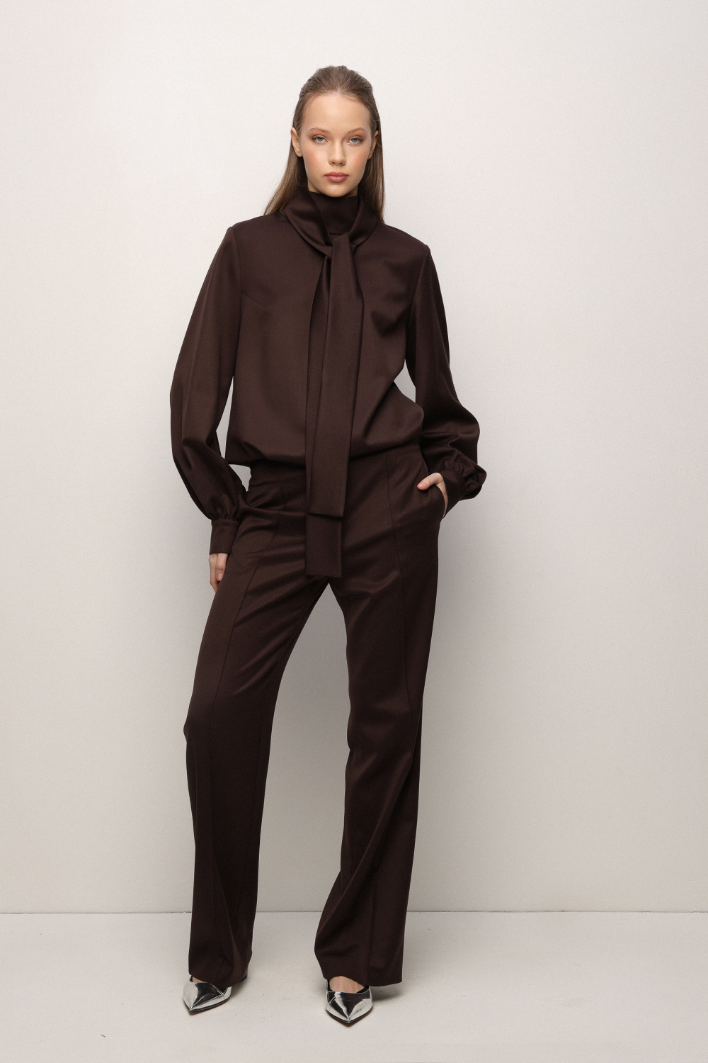 Chocolate brown straight-leg trousers with a smooth drape and sharp crease, lending the silhouette refined precision.