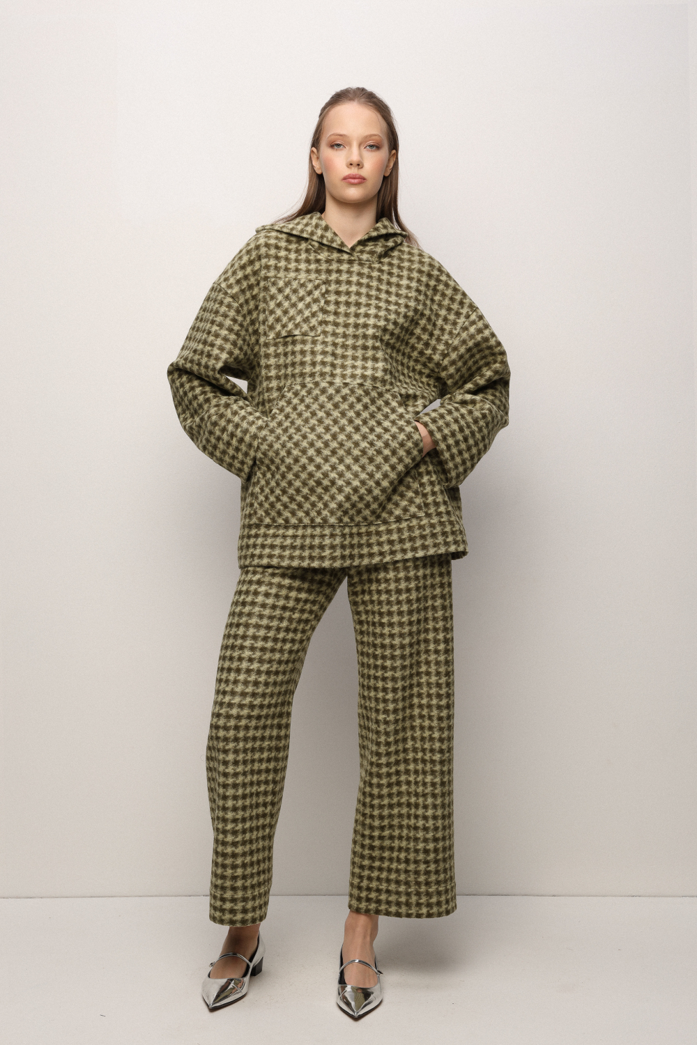 Wool bomber-style jacket with a hood and large front pocket, finished in a green–beige checkered texture.