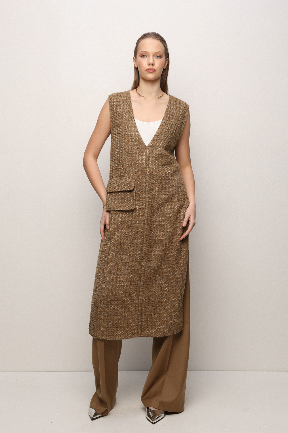 The Marlo Laz vest redefines layering with its structured tweed texture and minimalist silhouette. Designed with a deep V-neckline and a single oversized flap pocket, it pairs effortlessly with trousers or skirts, making it a versatile statement piece.