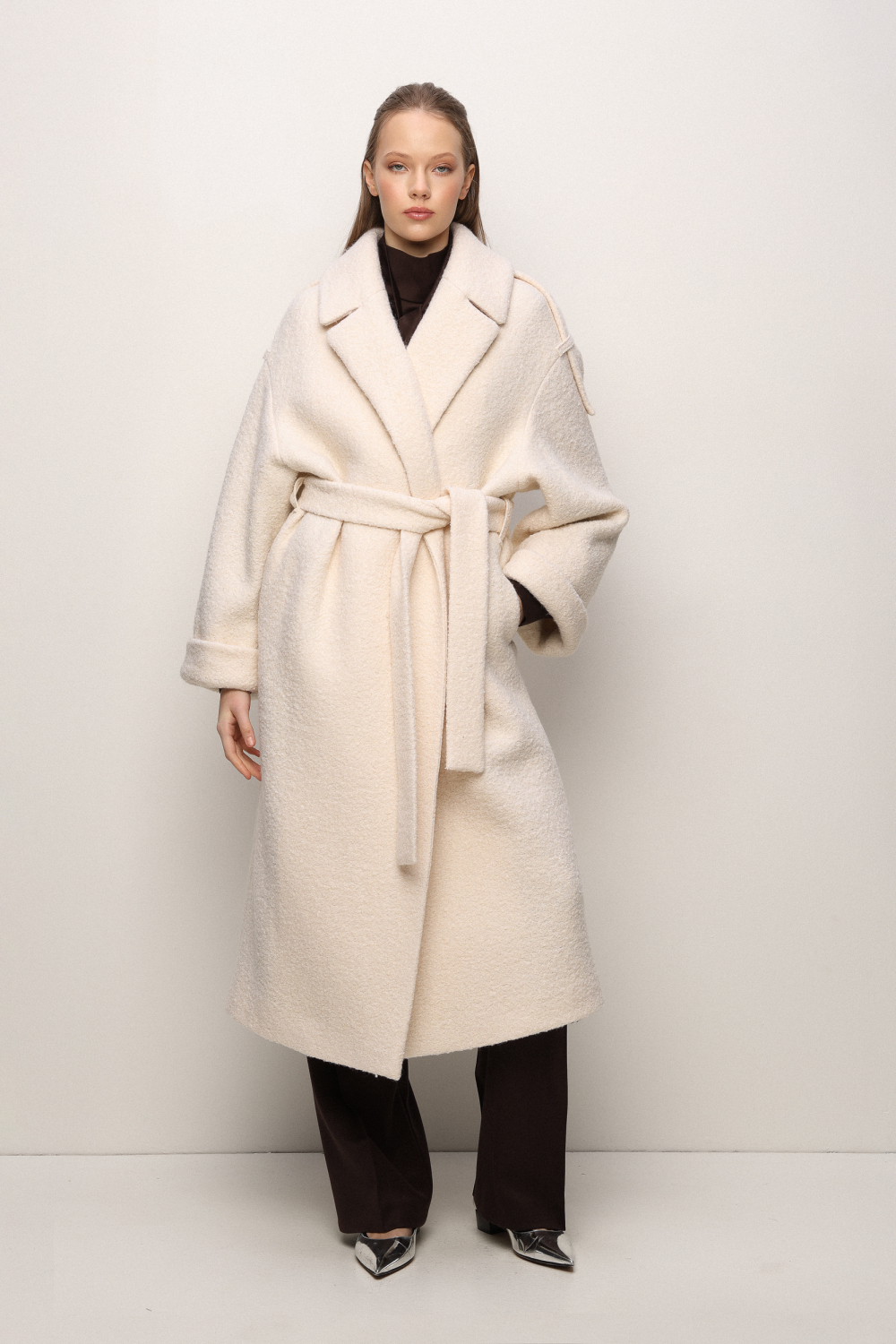 The Pandora Coat embodies quiet power and timeless elegance. Cut from textured ivory wool, it drapes in a voluminous silhouette that wraps the body in warmth and sophistication. Its oversized lapels and generous belt highlight the waist while maintaining an effortless flow. This is the coat that turns winter dressing into a statement of refined confidence.