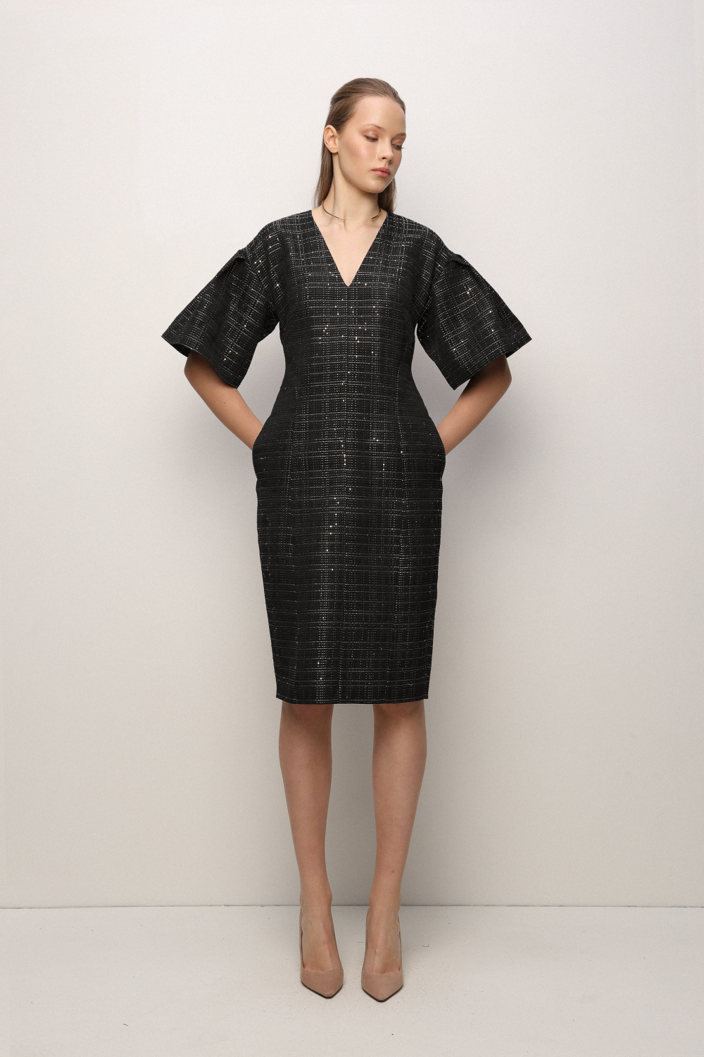 The Winston dress redefines power dressing with refined glamour. Crafted from black tweed shot with subtle metallic threads, it features a sharp V-neckline, sculpted waist, and structured short sleeves that add a modern architectural edge. The knee-length cut balances sophistication and strength — an elevated piece for both business and evening affairs.